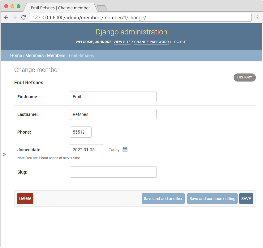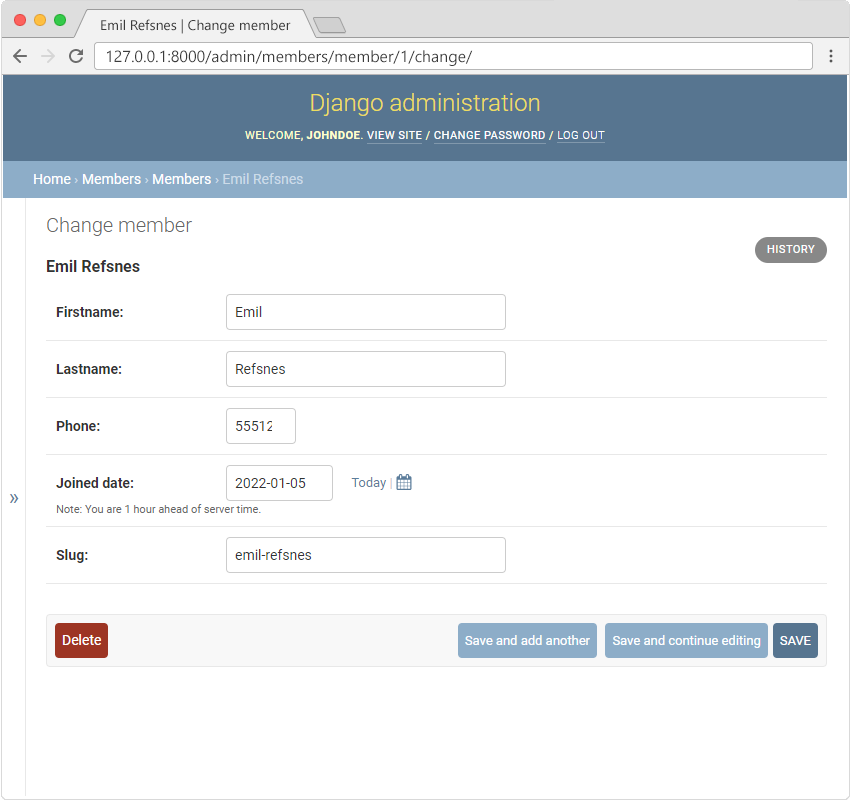 Click "SAVE" and the "slug" field will be auto populated with the firstname and the lastname, and since the "slug" field is of type SlugField, it will "slugify" the value, meaning it will put a hyphen between each word.