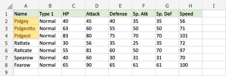 The names "Pidgey", "Pidgeot", and "Pidgeotto" all start with "Pidge", so all these cells are highlighted.