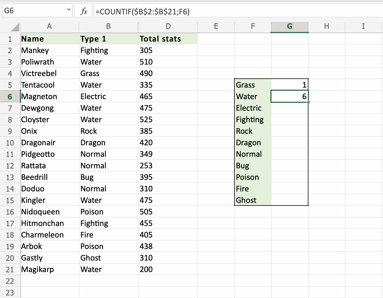That is great! The COUNTIF function has counted 6 Water Pokemons in B2:B21.