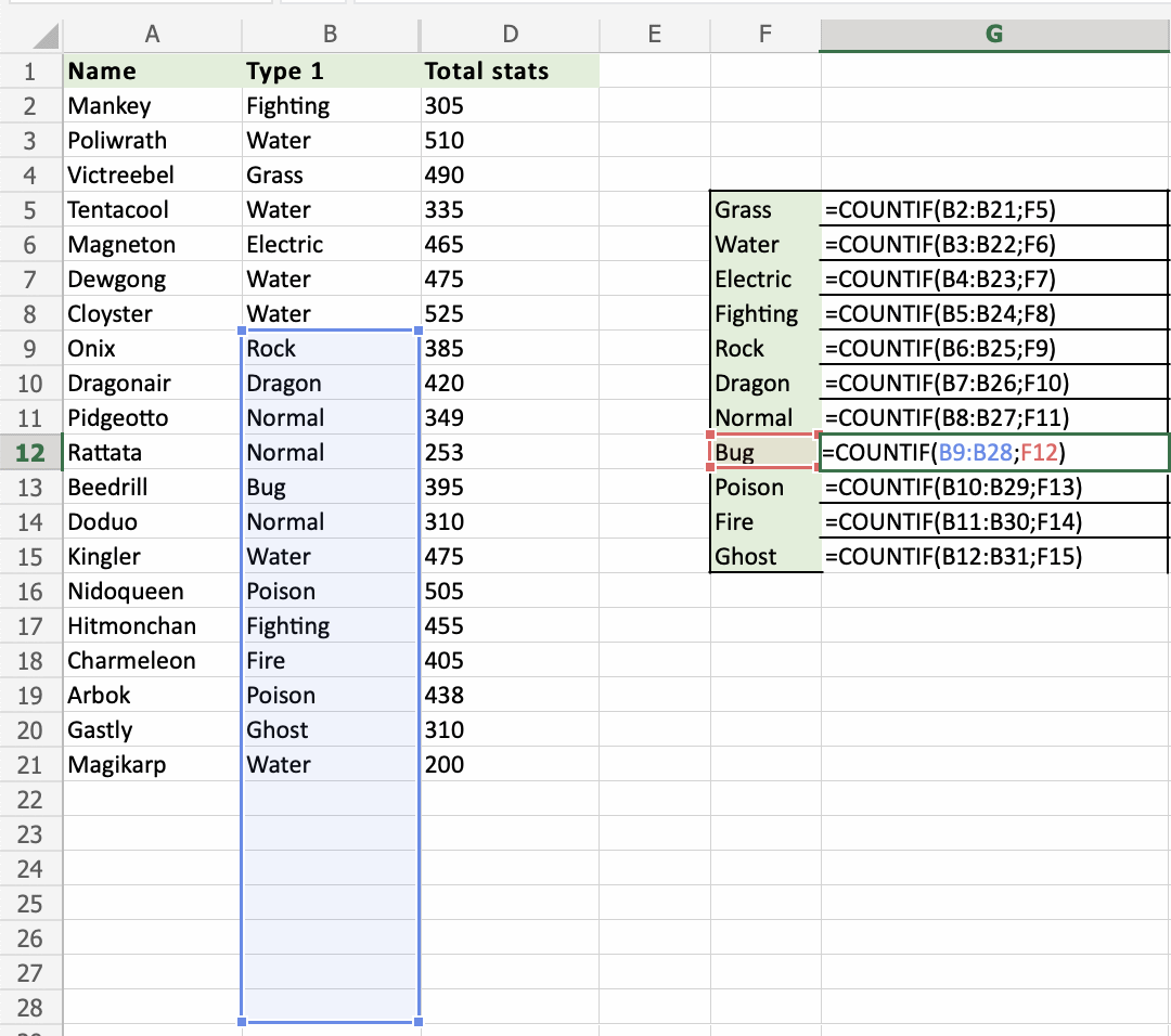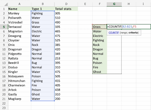 Apply the COUNTIF function to range B2:B21, to count how many Pokemons we have in the different types: