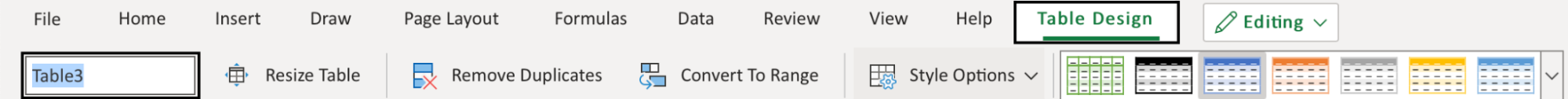 - Style options (Total row, Header row, Banded row etc..)