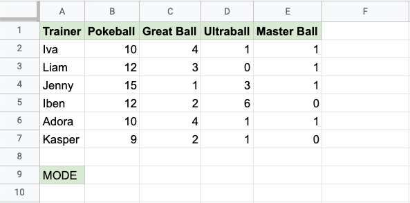 B2:E7for all the different types of Pokeballs - Hit enter