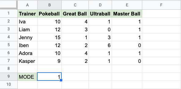 The MODE function is a premade function in Google Sheets, which is used to find the most common value(s).