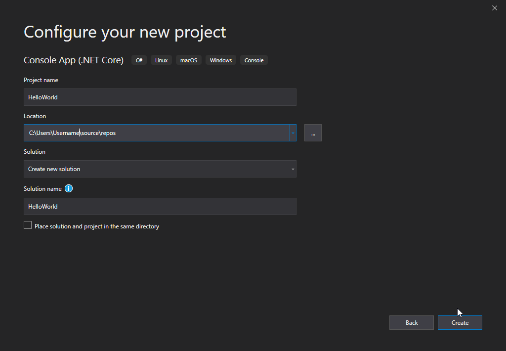 C:\Users\Username\source\repos\HelloWorld\HelloWorld\bin\Debug\netcoreapp3.0\HelloWorld.exe (process 13784) exited with code 0.