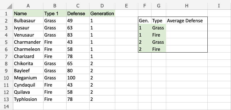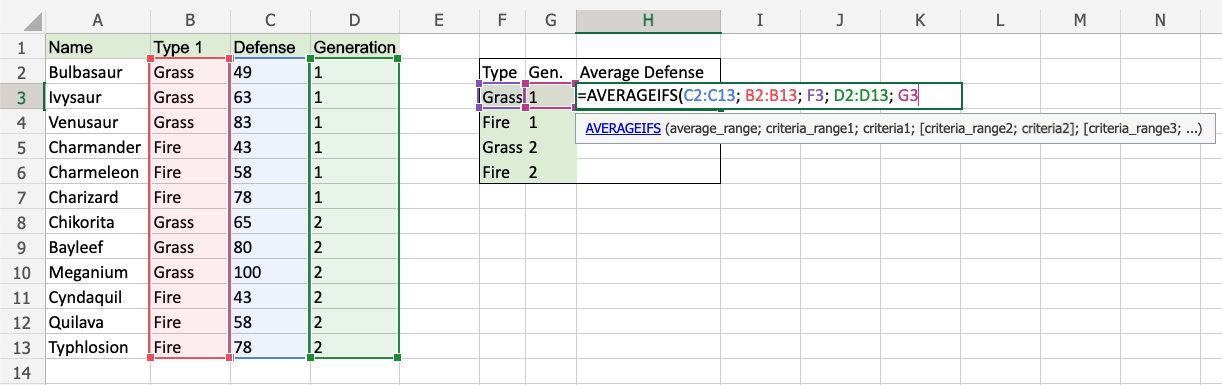 The function now calculates the average defense value of the 1st Generation Grass type Pokemon: Bulbasaur, Ivysaur and Venusaur.