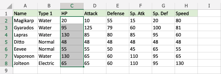 1. Select the range C2:C8 for HP values