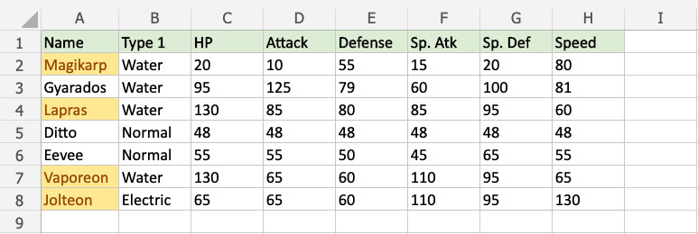 Now, the cells with text values later in the alphabet than "Gyarados" will be highlighted in yellow: