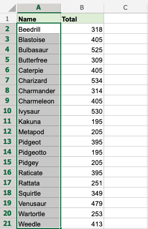 In this example we have two columns with related data. Column A is the Pokemons Names and Column B is their Total stats. Try sorting just one of the columns (A2:A21) ascending by their Names.