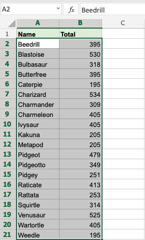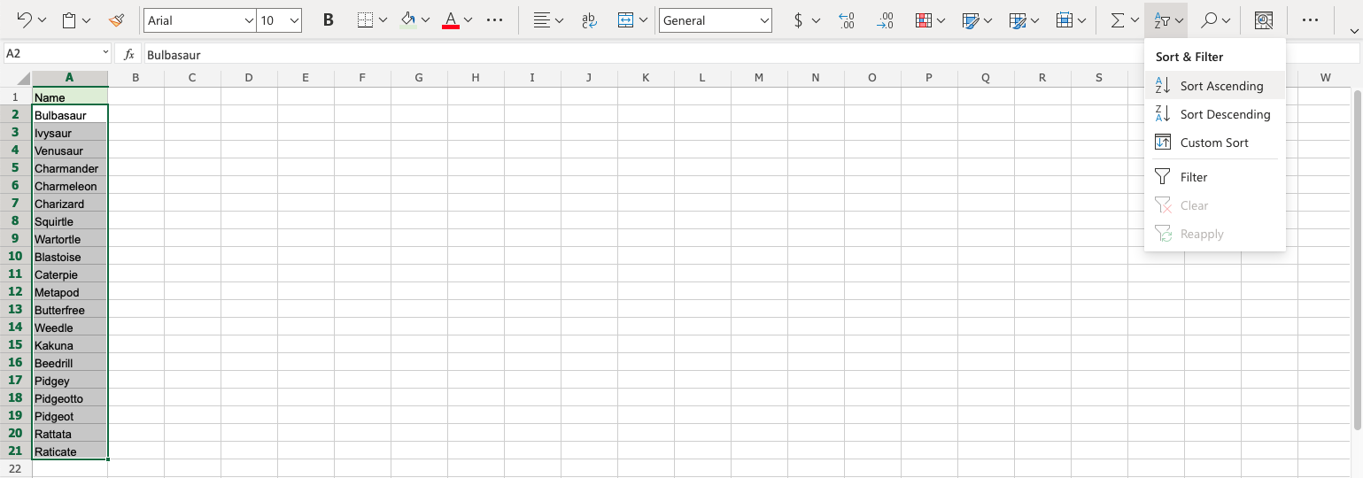 Sort the Pokemons in the range A2:A21 by their Name, ascending from smallest to largest (A-Z).
