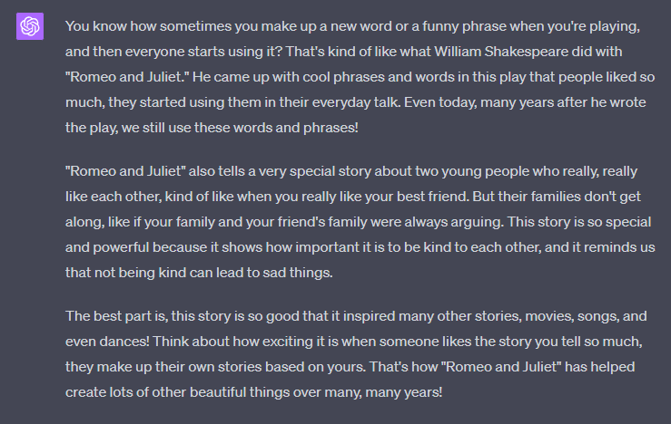 Explain to a 5-year-old how "Romeo and Juliet" written by "William Shakespeare" became such a historically important work. The explanation should be no more than 3 paragraphs.